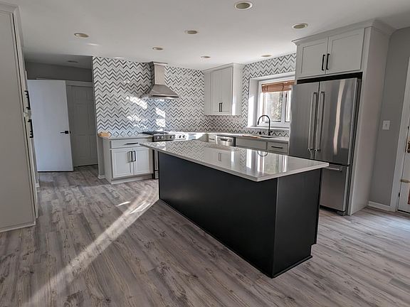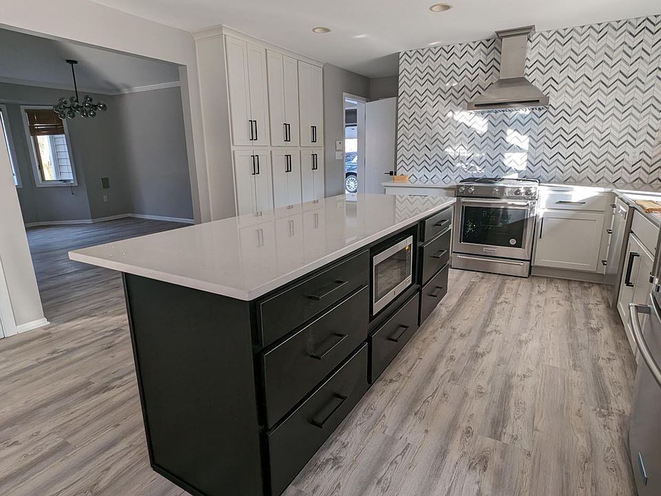 Modern, updated kitchen Features clean quartz countertops, a spacious island and plenty of storage/cabinets