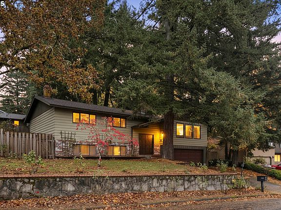Happy Valley Late-Century Modern Retreat! live among the trees in this beautifully preserved split-level on a lush ¼-acre corner lot. Perched above the street, the home captures forested territorial vistas and twinkling views of the city and West Hills. Inside, the main living area centers around a striking floor-to-ceiling brick fireplace — the true heart of the home — framed by expansive picture windows and warm wood accents. The upper level features an open great room, formal dining, and a bright eat-in kitchen with a breakfast nook. Down the hall, find three spacious bedrooms including a primary suite with ensuite bath and generous closets, plus a large secondary bath with full tub, shower, and double vanity. The lower level offers a flexible bonus living area with a second brick fireplace, bedroom, office/den, full bath, and laundry room with convenient access to the attached garage. Outside, a spacious deck and terraced yard are perfect for gardening, entertaining, and pets, surrounded by mature trees and peaceful natural beauty. Set beside the Scott Mountain neighborhood trail system, nature lovers will appreciate nearby walking paths, greenspaces, and a seasonal creek. Minutes to Mount Scott Elementary, Altamont Park, Sunnyside, Costco, New Seasons, Fred Meyer, Home Depot, and Clackamas Town Center, with quick access to Johnson Creek and I-205.