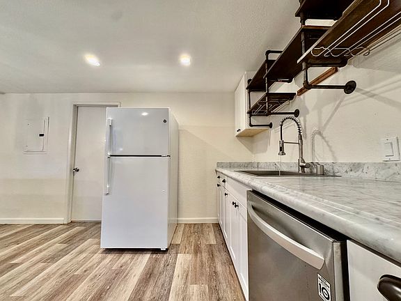 The kitchen is a true showstopper fully updated with beautiful marble countertops, stainless steel dishwasher, a gas stove and white Fridge, kitchen island, and a stylish pot rack/ shelving above the sink. It's a chef's dream with an effortless flow from the kitchen into the dining and living room areas, perfect for gatherings of all sizes or housemates.