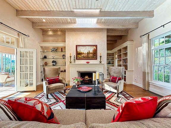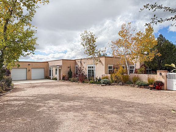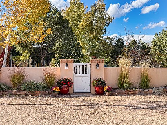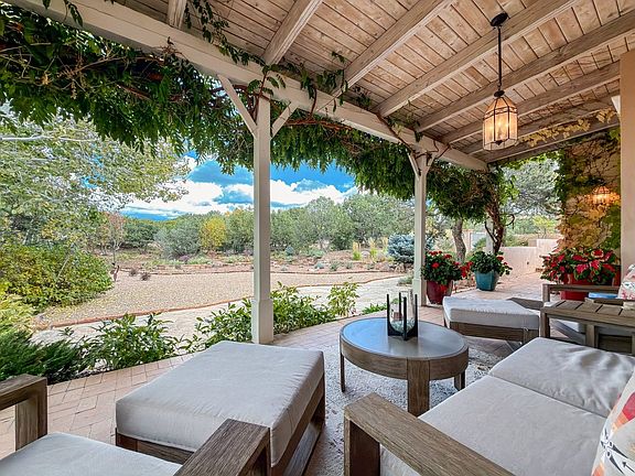 Nestled on 1.7 acres of lush, landscaped grounds near Bishop's Lodge Road, this timeless Territorial estate embodies the essence of Southwest living just five minutes from the Plaza. Behind a welcoming electronic gate, discover serene gardens and mature trees that set the tone for a private retreat filled with warmth and character.