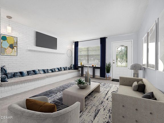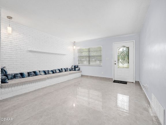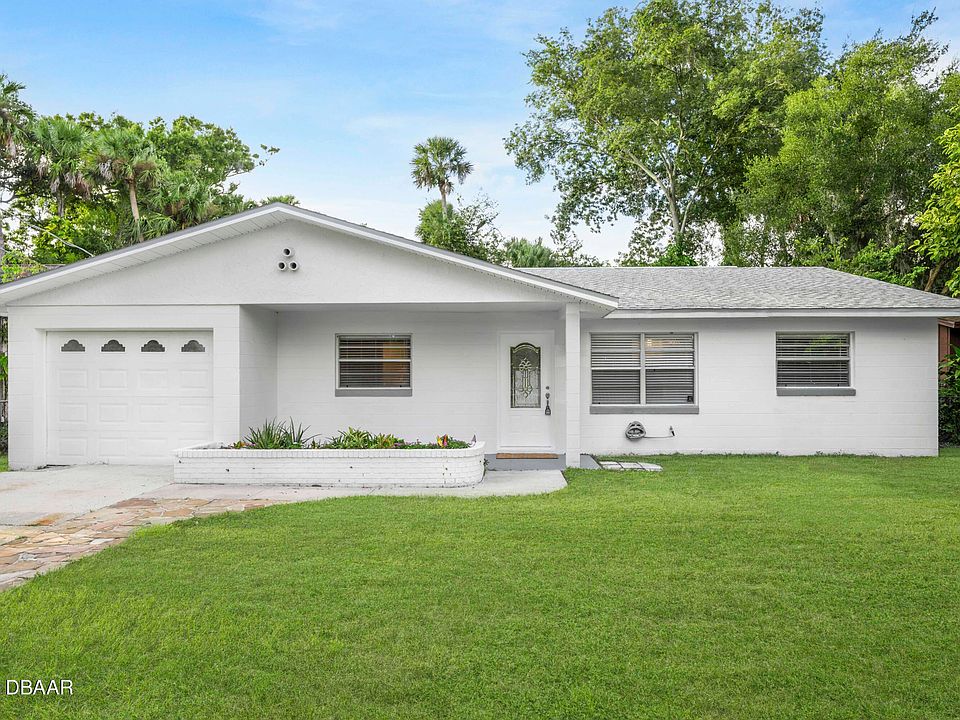 Welcome to this beautifully re-imagined concrete block 3-bedroom, 2-bath home in Daytona Beach, offering over 1,300 square feet of living space where contemporary design meets everyday ease and Florida living. Every detail has been updated for style and comfort, with a one-car garage for added convenience. Step inside to an open floor-plan that flows effortlessly—large windows allow natural light to pour in, and gorgeous tile flooring runs throughout for a clean, low-maintenance foundation. The living and dining rooms feature chic white-washed brick interior walls, adding character and texture while keeping things bright and fresh. The new kitchen is a standout: sleek stone countertops, custom backsplash, high-end stainless-steel appliances, and a peninsula counter for breakfast, casual dining, or hosting guests. Whether preparing a weekday breakfast or entertaining friends, this kitchen delivers. The generous primary suite provides a retreat-like vibe, complete with a deep walk-in closet (with solid built-in shelving) and an ensuite bath featuring a beautifully designed stand-up shower. Two large guest bedrooms both offer deep closets for ample storage. The guest bath invites with a stylish shower/tub combofunctional and elegant. From the dining area, large sliding doors open out to a spacious fenced-in backyarda perfect Florida outdoor living space. It's big enough for play, pets, or simply soaking up the sunshine in privacy - and even comes with papaya tree! Meanwhile your washer/dryer sit in the one-car garage, brand-new and ready to go. No HOA means more freedom and lower monthly overheadideal for home-buyers who value independence and location. 2016 Roof, 2025 water heater, 2022 appliances, 2024 AC.