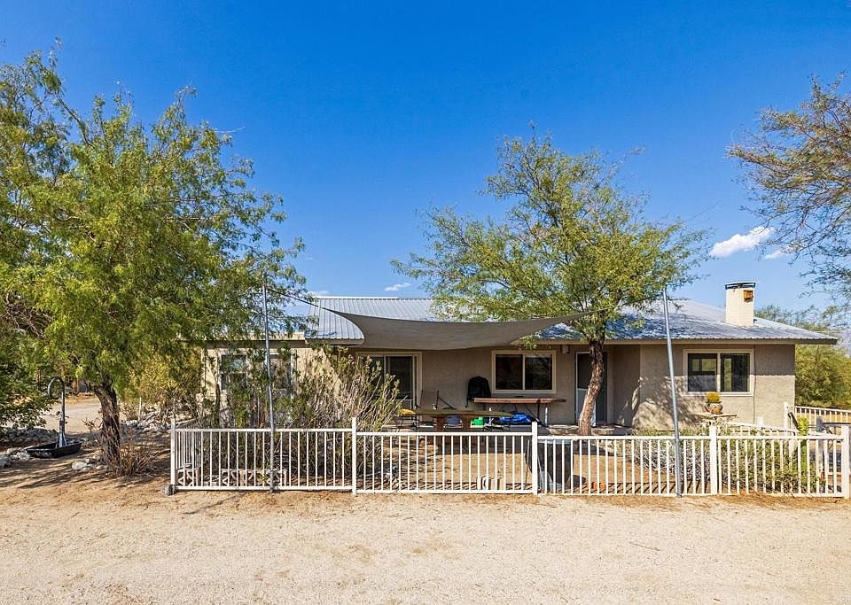 Nestled on 4.87 serene acres, this charming 2-bedroom, 2-bath home offers 1,092 sq. ft. of comfortable living space, perfect for a remote desert getaway. Built in 1980, the home features a spacious kitchen with solid surface countertops, plenty of cabinetry, and tile flooring, which extends into the living room and bathrooms for easy maintenance. A versatile bonus room can serve as a 3rd bedroom or home office. Well pump was replaced about a year ago and has a 25 year warranty. In addition to the main house, a cozy guest cottage with its own bath and kitchenette provides extra space for visitors or rental potential. Outside, you'll find a lovely front patio to enjoy peaceful desert evenings. The property includes a well, offering self-sufficient living in this quiet, remote location. Perfect for those seeking tranquility and a connection with nature!