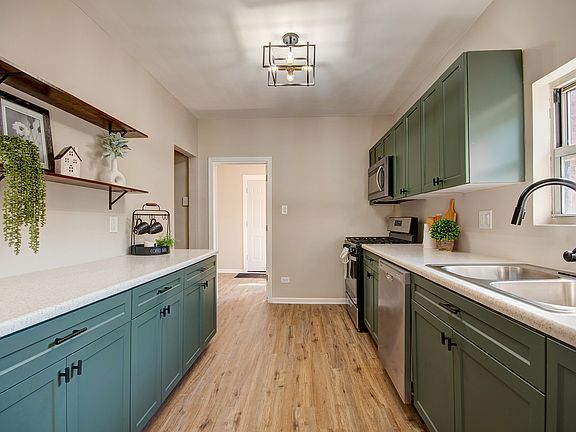 Beautifully rehabbed brick bungalow with 5 bedrooms, 2.5 baths modern updates and timeless character. Inside, enjoy gleaming hardwood floors, new carpet, and freshly painted interiors. The open-concept kitchen and dining area includes all new appliances, making it perfect for gatherings. The first floor offers 2 bedrooms, a full bath, a welcoming foyer with access to the deck, and an office adjacent to the primary bedroom-perfect for work-from-home or a private retreat. The upstairs level features 3 additional bedrooms, a full bath, and bonus room is perfect for a reading nook or play area. The partially finished basement provides room to grow, offering space for an entertainment area or second living room, plus a half bath and plenty of storage. Peace of mind comes with major updates: new roof, furnace, AC, water heater, and a newly built 2-car garage. With stylish finishes and flexible living space throughout, this home is truly move-in ready.