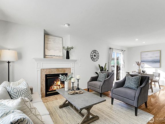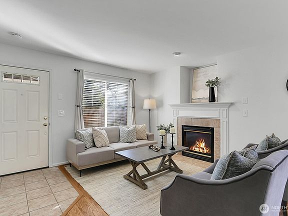 Light filled, end unit townhome w/fully enclosed yard! Enjoy this updated home (no HOA dues) w/open living + dining areas, cozy gas fireplace + sunny kitchen w/gas cooking, French door refrigerator + maple cabinetry. Head over to your west facing back yard featuring a spacious deck w/built in seating + entertaining area, flower boxes + beautiful greenery, fully fenced too! Upstairs find the spacious primary w/vaulted ceilings, walk in closet + wood blinds, 2nd bedroom w/treed view, convenient upstairs laundry, full, updated bath w/solid countertops + cabinet w/storage, storage closet by the entry, assigned parking spot in the alley, superb location close to Northgate Station, restaurants, shopping, Kraken Community Iceplex + Link Light Rail