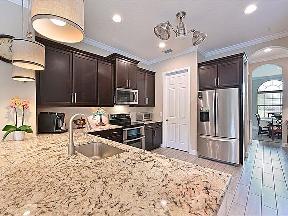 Welcome to this beautifully maintained pool home located in a small gated community with no CDD fees and low HOA. Built just 8 years ago, this spacious residence sits on an oversized homesite and offers over 3,000 sq ft of well-designed living space, including a den/office and a large bonus room – perfect for working from home or entertaining. Inside, you’ll find elegant touches throughout, including plank tile, crown moulding, quartz countertops, and 10-foot ceilings. The open-concept kitchen and living areas flow effortlessly out to a screened-in saltwater heated pool and extra large fenced backyard, ideal for relaxing or hosting gatherings. Other standout features include a tile roof, three car garage, paver walk ways, curb it surrounding the upgraded landscaping, and ample natural light throughout. All of this is nestled in a peaceful, private community just minutes from top-rated schools, shopping, and dining. Don’t miss the opportunity to own this exceptional home – schedule your private showing today!