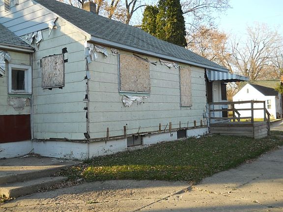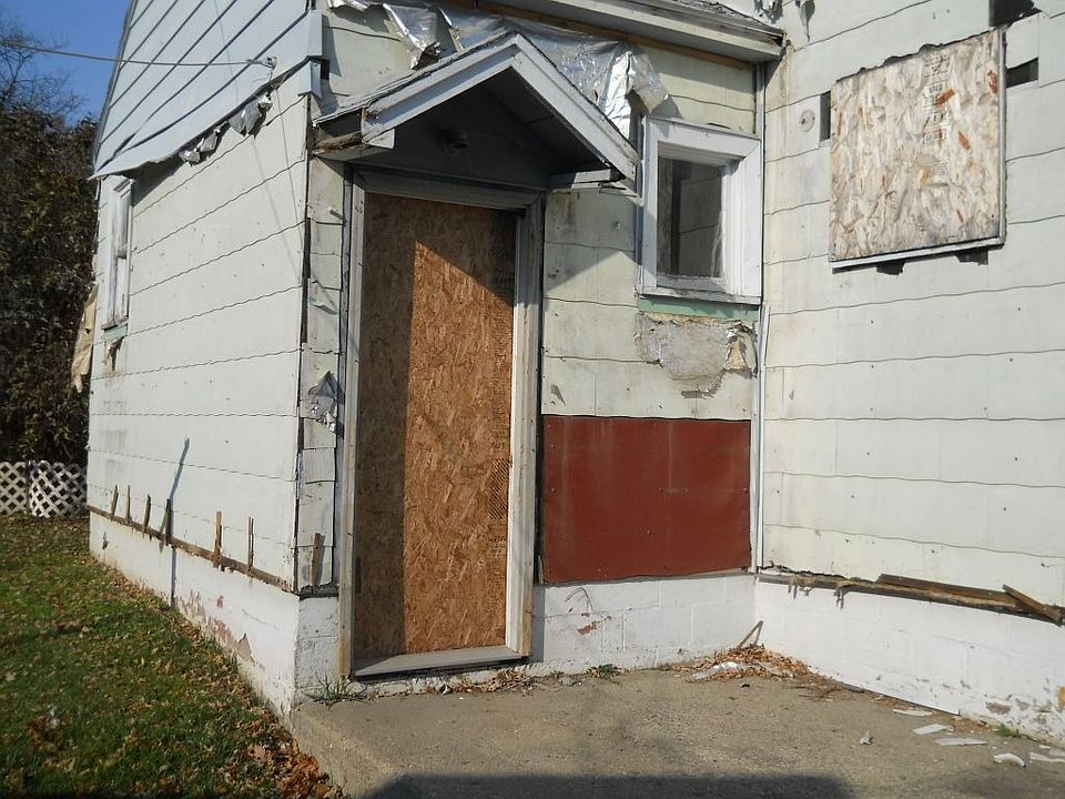 Exterior Features: On the exterior there is partial aluminum siding. The windows are intact. The shingled roof needs to be replaced. There is a small front porch. The driveway is concrete. The is a single un-attached garage without a garage door. There are no eaves troughs. The soffits are not intact. The yard is clean with a pine tree in front. There are no trees in the back. Interior Features: The living room carpet is in poor condition. There is one bath with nothing in it. The kitchen cabinets are intact but there is no sink or appliances. There are two bedrooms with carpet in poor condition. There is no not water heater or furnace.