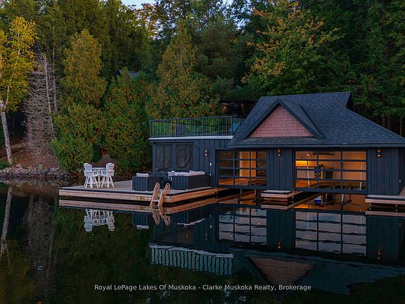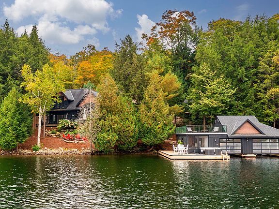 Welcome to your dream Muskoka retreat on the highly sought-after shores of Lake Joseph. This beautifully appointed 3-bedroom, 2.5-bathroom cottage combines timeless charm with modern updates and a layout designed for effortless family living and entertaining.At the heart of the cottage is an open-concept great room, dining area, and a newly updated Chervin kitchen, all anchored by a stunning 2-sided wood-burning fireplace that also warms the adjacent Muskoka room perfect for enjoying the outdoors year-round.The cottage is ideally positioned close to the waters edge, offering seamless access to every corner of the property. Extensive landscaping creates natural flow from the main cottage to the2-slip boathouse, complete with an upper-level rooftop deck, generous dock space, and room to relax or entertain under the summer sun.Additional accommodations include a spacious 2-bedroom bunkie, featuring one king-sized suite and a second bedroom with custom built-in bunk beds plus a queen bed, a 3-piece bathroom, and a convenient kitchenette comfortably sleeping up to six guests. A 2-car garage protects your toys with ample storage above. Enjoy long lake views, privacy, and a thoughtfully designed layout that ensures easy connection between the cottage, boathouse, bunkie, and garage all just steps apart. Conveniently located just off Highway 400, this property offers easy access from the GTA, making weekend escapes or extended stays a breeze.