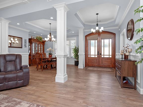 Welcome to your own private sanctuary! This custom 5-bedroom 3.5 bath is located on a quiet one street cul-de-sac. The 15-acre property is approximately half pasture and half woods with large hardwood trees and a peaceful creek along the back of the property. Horses are welcome! The property is suited for agricultural use, outdoor recreation, or simply enjoying the natural setting. A tree lined driveway leads to the large welcoming front porch. Step through the arched double door entry revealing an open and inviting layout. The large living area has a coffered ceiling and a raised hearth stone fireplace. The kitchen boasts an oversized island, double ovens, large walk-in pantry, under cabinet lighting, coffee bar, crown molding, and a cook top accented with a beautiful stonework. The Primary bedroom has separate his/her walk-in closets. The Primary bath has a walk-in shower and a heated jacuzzi tub. Upstairs is the 5th bedroom or Flex Room with kitchenette, full bath, and walk-in closet. You feel safe during storms in the lower level Bunker/Storage. Watch the deer from the oversized covered patio with a wood burning fireplace and TV. Whether you are looking for a farm, horse property, or simply a private retreat with room to roam, this home has it all. Also included are 2-50 Amp outlets. The 1st is in the garage, which can be used for E/V hookup or a Welder. The 2nd is on the outside of the home and is great for connecting your RV. Experience the perfect combination of privacy and versatility-just minutes away from town, yet a world away from the everyday.