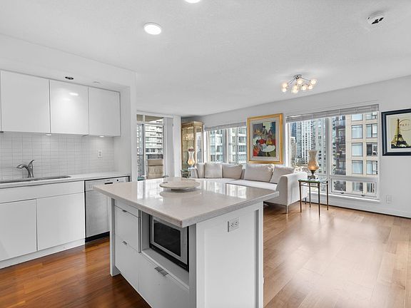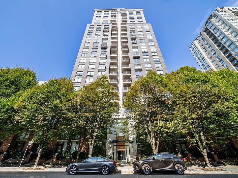 Experience modern elegance at DOMUS on the edge of Yaletown. This bright and airy corner 2-bed, 2-bath corner home showcases elevated and nearly 180 degree views from NE to NW, capturing both the city skyline and North Shore mountains. With its north-facing exposure, it stays cool year-round while still receiving plenty of natural light. Inside, you’ll find hardwood floors, renovated white quartz counters, and an expanded kitchen island. The thoughtful layout includes a stylish Jack and Jill shower and a versatile flex room, currently used as a second walk-in closet but could also serve as storage or an office. Complete with a separate storage locker and one parking stall, this is one of the most efficient and desirable starter two-bed homes in the building. A true Yaletown gem!