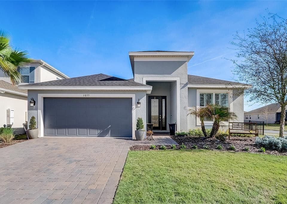 Why wait for new construction? Shows better than model! Set in the rolling hills of Clermont, this resort-style pool home was built in 2020 and still feels brand new! The spacious floor plan includes 3 bedrooms, 2 full bathrooms, a French-door bonus room/Den/Office, formal areas for gathering & dining, gourmet kitchen with gas cooking, and an open-concept family room that faces the pool. The bedrooms are organized in a split plan arrangement and the bonus room creates a triple split plan. The primary suite has windows facing the pool along with 2 custom walk-in closets equipped with multiple organization options along with shelves to display your favorite items. All interior lighting and ceiling fans have been upgraded, interior shutters have been added to the windows, the oversized 3-panel sliding glass pocket doors leading to the pool have remote-controlled shades, and the family room’s built-in TV mount has a swing-out arm to allow your TV to face the pool. The resort-style, chlorine premium pool was added in 2022 and was designed with fountain features, a sunshelf, color-changing underwater lights, and electric heat pump. Additionally, electric outlets were added to the pool deck for easy outdoor living. The Canyons at Highland Ranch offers recreational amenities to homeowners such as a community pool, splash pad, playground, basketball, sand volleyball, firepit area, and dog park. The community provides a convenient location near shopping, restaurants, FL Turnpike, and the South Lake Trail/Lake Apopka Trail. Go out and explore, then come back to your daily staycation and find refuge from the outside world. It will be your favorite place to be!