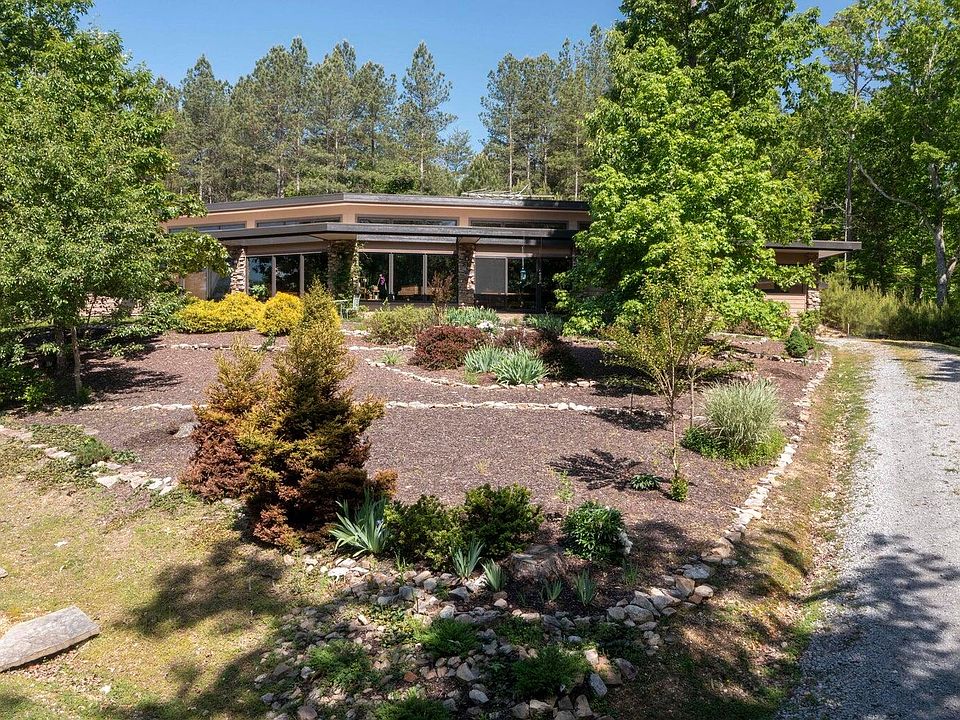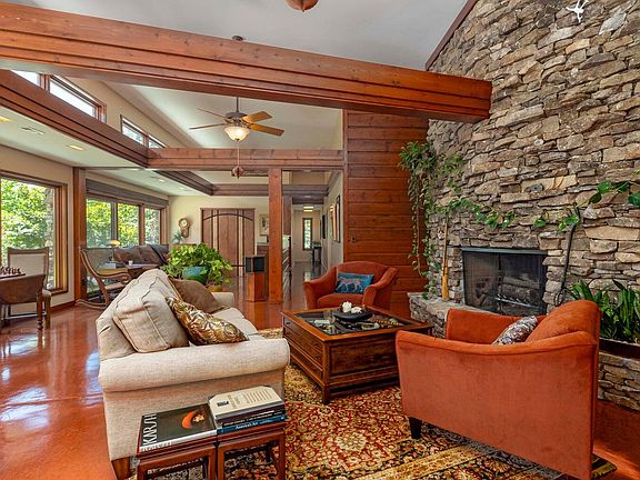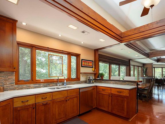 Introducing this remarkable 3 BR/3BA home (on 3.48 acres) designed with inspiration from the legendary Frank Lloyd Wright. As you enter, you'll be greeted by an open concept layout featuring stunning wood beam accent ceilings that infuse the space with a welcoming atmosphere. The living room showcases a wood fireplace adorned with exquisite stacked stone, creating the perfect setting for cozy evenings. The kitchen is a culinary enthusiast's delight, equipped with quartz countertops, stainless steel appliances, and a gas stove. Sunlight streams through the many windows in the living room, dining area, and kitchen, illuminating the space beautifully. The primary bathroom boasts a luxurious walk-in tiled shower and a double vanity. One guest room features an en-suite bathroom with a single vanity and bath/shower combo, while the second guest room offers built-in bookshelves and is conveniently located next to the third bathroom. The dining area leads to an office (equipped with a Murphy bed) with gorgeous pocket doors. Other notable features of this home include a spacious pantry/laundry room, floor heating throughout the house, a screened-in back porch, and a workshop in the backyard. Nestled on 3.48 acres of meticulously landscaped grounds, this property is just minutes away from the water and offers a winter lake view. Don't let this opportunity pass you by to own this architectural marvel in a serene setting!