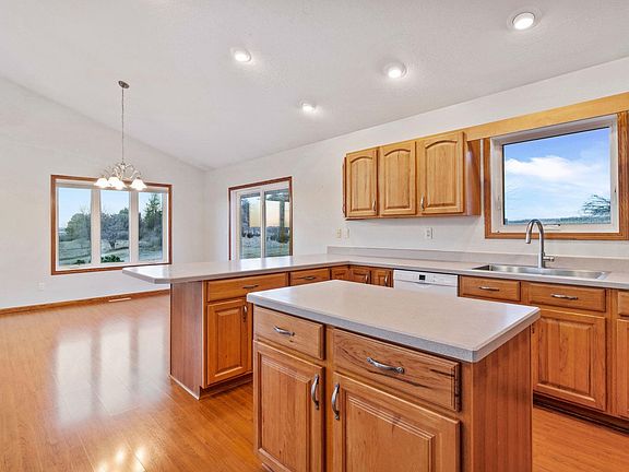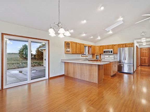 Some of the BEST sunset views in Black Hawk County! This newer acreage has 3 acres of privacy with the amenities of newer construction. Open concept with 3 bedrooms on the main floor, kitchen island, main floor laundry, attached garage to the mudroom/laundry and great natural daylight! The windows, siding and steel room were all updated the summer of 2017. The furnace and a/c were new in 2019. The lower level family is huge with a wood burning stove and features a beautiful walk out to a patio area. The options are endless for gardening, chickens and small farm animals. The sellers will be taking the current chicken coop, fyi.
