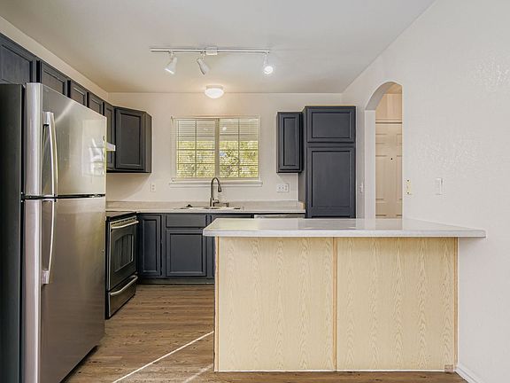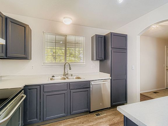 Welcome to this charming 3-bedroom, 2.5-bath home in the highly desirable Fox Run community of Northglenn. Inside, the living room feels open and airy with soaring ceilings and oversized windows that fill the space with natural light, creating a warm and inviting atmosphere perfect for both entertaining and everyday living. The updated kitchen features stainless steel appliances, sleek dark cabinetry, and generous counter space, including a breakfast bar that connects seamlessly to the dining area. Upstairs, the spacious primary suite offers vaulted ceilings, a striking arched window, and a private ensuite bathroom with dual sinks and a walk-in closet. Two additional bedrooms provide flexible space for family, guests, or a home office.