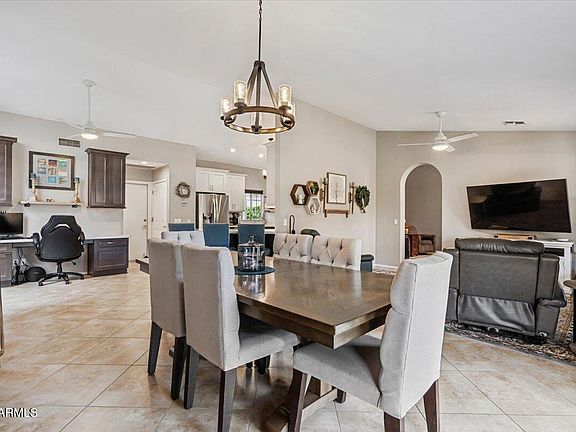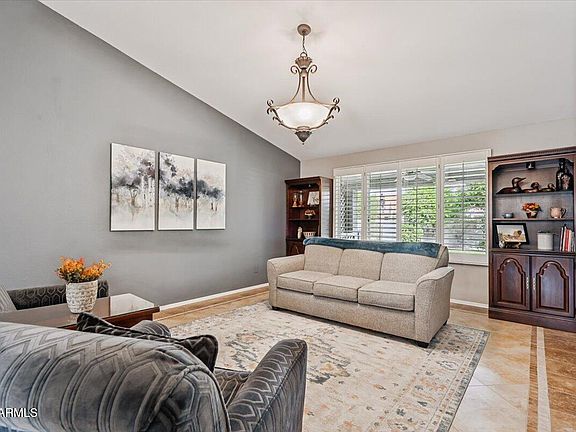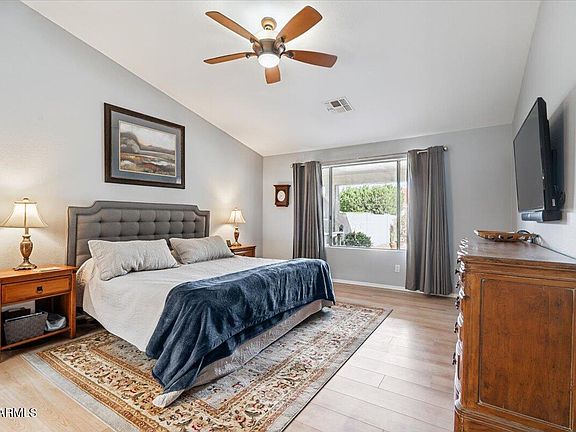 Every major system of this sought-after Palacia model has been thoughtfully updated for peace of mind and modern efficiency. Recent improvements to this move-in ready home include roof (2021), HVAC system (2024), hot water heater (2022), and water softener, reverse osmosis, and whole-house filtration system (2021). Inside, the home features vaulted ceilings, fresh interior and exterior paint, and a beautifully remodeled kitchen with soft-close 42'' shaker cabinets, quartz countertops, designer tile backsplash, new stainless steel appliances, and a pantry for additional storage. The bedrooms were updated with new flooring in 2021, and the primary suite offers an ensuite bath and walk-in closet. The garage features built-in cabinets for organized storage. Step outside to a private fenced backyard with lush landscaping and mature fruit trees, a garden and potting area with outdoor sink and table, and a storage shedperfect for enjoying the Arizona lifestyle. This home has been well-kept and offers excellent curb appeal!