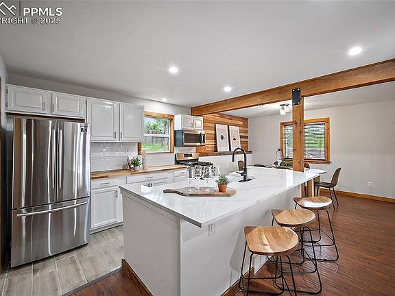 Perched on a hill with sweeping views of the Sangre de Cristo range and the Rocky Mountains, this home offers the kind of space and serenity that feels worlds away, yet it’s just minutes from I-10, Fort Carson, and Peterson. From spectacular sunsets to the quiet beauty of snowfall through the windows, every moment here is framed by nature’s backdrop. This private oasis is surrounded by respectful neighbors, wide open space between homes, and a sense of peace and privacy. Whether you’re relaxing by the wood-burning fireplace, cozying up with the electric fireplace in the great room or secondary bedroom, or enjoying the warmth of whole-house electric heat, the lodge-like beams and posts create a welcoming, rustic ambiance. Inside, the layout is designed for both comfort and function. A galley kitchen makes cooking easy while guests gather at the island. The main-floor office is filled with natural light, while upstairs, the washer and dryer are conveniently located near the bedrooms. Thoughtful features like tinted windows, a windowed pantry, and a three-season sunroom provide everyday comfort. The covered front porch is perfect for quiet mornings or greeting guests in style. Outdoor spaces are just as inviting: sip coffee while watching the sunrise on the back porch, unwind on the upper deck off one of two primary suites as the sun sets, or entertain on the nearly flat backyard that’s perfect for gatherings, games, or simply soaking in the views. A balcony doubles as a greenhouse or pet space, and the property includes two storage sheds, a wood fence (neighbor-owned), and an enclosed dog area with ramp access from the second floor. Practicality meets flexibility with a carport plus storage space that can be turned back into an attached garage, RV parking, and a double driveway with extra guest parking below. There is no HOA so you have the freedom to use your property as you need to.