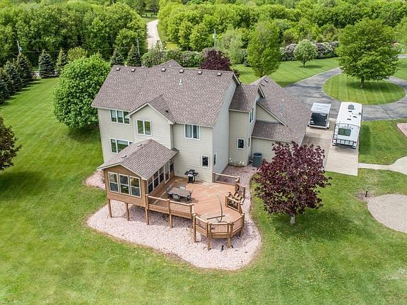 Stunning 4 bed 4 bath home situated on a spectacular 3.28 acre lot w/ 40x62 detached garage.This open concept and well cared for home features Cambria counter tops, Samsung stainless steel appliances, a main level office, spacious mud room, new furnace/AC, screened porch, large deck and a front porch. All 4 bedrooms are generous in size and on the same level. The private master suite offers a vaulted ceiling, huge walk in closet, dual vanity and separate tub/shower. The lower level has great areas to entertain guests and a double sided fireplace. This spectacular acreage home includes a 40x62 detached garage that features dual zone radiant heat, wifi controlled thermostat, satellite and internet TV ready, concrete floor, 10' doors, drain, 400 amp service and is large enough to accomodate up to 12 vehicles. All of this plus amazing views makes this home a must see.