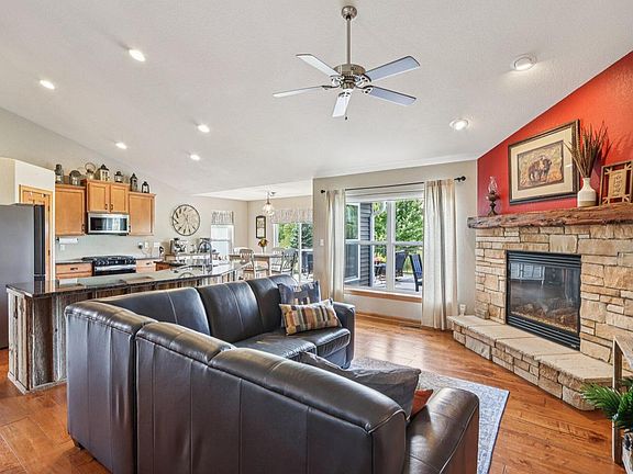 Beautifully designed 4BR, 3BA home with a flowing open concept layout, vaulted ceilings, and stylish split-bedroom design. The chef's kitchen shines with granite counters, SS appliances, large island, and cozy breakfast nook with patio doors leading to a backyard oasis. Relax in the vaulted living room with a stunning lannon stone fireplace, or entertain in the formal dining room framed by graceful arched entrances. Luxurious primary suite features a tray ceiling, dual sinks, WIS, and jetted tub. Lower level offers 4th BR, full bath, rec room, and wet bar. Step outside to a deck and patio overlooking a scenic pond with pier--perfect for kayaking or unwinding!