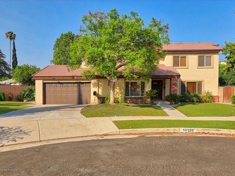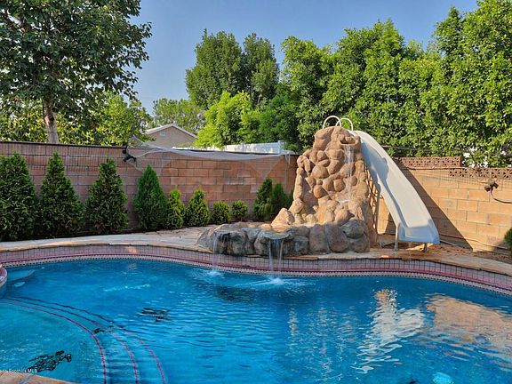 This 2 story 6 bed and 3 3/4 bath Granada Hills home is located at the end of a quiet cul-de-sac. Enter the foyer with an octagon dual pane skylight leading to the step down living room with custom built-in maple wood media center and coffered ceilings. The dining area has a full floor to ceiling wall mirror adjacent to the kitchen with Caserstone countertops, dual wall oven, dishwasher, microwave and cooktop. Next to the kitchen is a breakfast nook with Caserstone countertops, sliding glass door leading to the pool area and switch for rear retractable awning. The separate family room has a brick fireplace and sliding glass door. Downstairs is a bedroom with built-in desk and cabinets which sits next to 3/4 bath. Master bedroom has a walk-in closet and bath with dual marble sinks, separate tiled shower and standalone tub. The loft has a view of the downstairs foyer. Private fully fenced salt water pool with baja shelf, waterfall, water slide and spa. Peach, apple, lime and orange trees in the backyard. 2 car attached garage is finished and insulated with automatic fans. Rest easy knowing you have maintenance free artificial turf on front, sides and read yard with automatic drip irrigation system. Keep in contact with the whole home intercom system, recessed lights and ceiling fans in all bedrooms, split level a/c, 2 tankless water heaters (1 in attic and 1 in garage). 2006 Remodel includes the living room, dining room, kitchen, breakfast nook and adding 3 bedrooms and 1 bathroom. 2010 update to downstairs bathroom. 2013 updates include font, side and rear landscaping, master bedroom, master bathroom, upstairs bathroom, upstairs bedrooms.