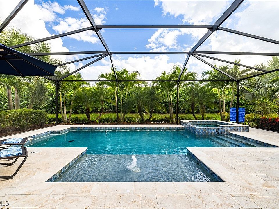 This stunning property is a must-see! The popular San Remo Floor plan boasts over $225,000 in upgrades, making it a truly luxurious home. The highlight of the property is the new saltwater pool with a Travertine deck, creating a private oasis surrounded by palm trees and lush foliage. The lanai features a summer kitchen for outdoor entertaining. Inside, the cabinets have been redone with elegant hardware, and all appliances are high-end Kitchen Aid models installed in 2021. The laundry room has also been updated with new cabinets, sink, and faucet. Additional upgrades include hurricane shutters on all windows, high-impact glass on the front window and door, crown molding, outdoor landscape and lighting, plantation shutters, fans and lights, reverse osmosis, security system, smart features, storage racks and epoxy floors in the garage, and more.