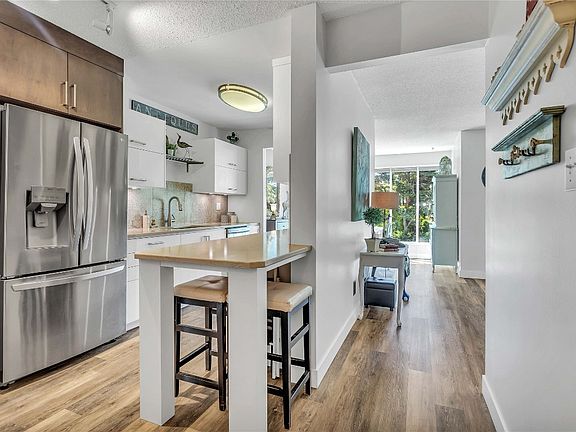 WELCOME TO #216-1056 BERNARD AVENUE! LARGEST IN THE COMPLEX AT 1314 SF. This Beautifully UPDATED 2 Bedroom 2 Bathroom QUIET CORNER UNIT in a 55+ community features a private WRAP AROUND DECK with SW EXPOSURE and LOVELY views overlooking the POOL and LUSH COURTYARD. Updates include: vinyl flooring throughout, a stylish professionally designed kitchen with quartz countertops, stainless steel appliances (double oven), pantry, sit-up breakfast bar plus a full main bath renovation. The spacious primary bedroom easily accommodates a king-size bed & features "his & her" closets and a full ensuite. Updated wall A/C units, in-suite laundry, and convenient pantry/storage room off kitchen. Bonus flex space with built-in shelving is perfect for a den or extended living room. Workshop and storage unit in secured parking garage. 1 parking stall with potential option to rent a second. Enjoy RESORT STYLE AMENITIES: Outdoor pool, indoor hot tub and saunas! PET FRIENDLY! (2 dogs/cats or 1 of each, dogs not to exceed 12kg & 24” at shoulder). IDEALLY LOCATED across from grocery stores, pharmacy, restaurants and medical services-just a short walk to downtown and the beach…Move in and embrace the Okanagan Lifestyle at 1056 Bernard!