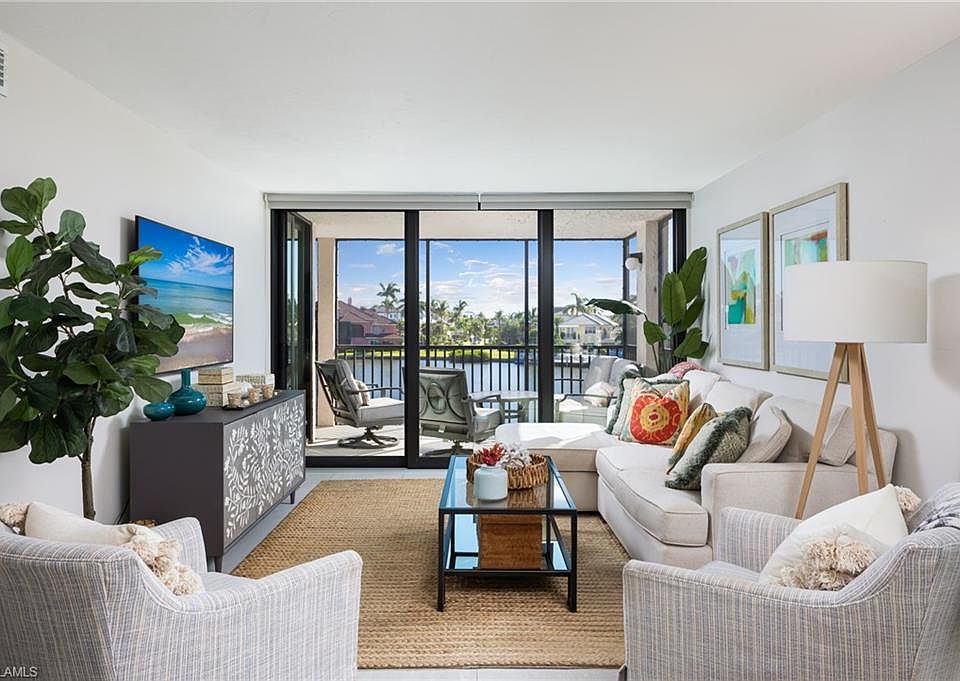 Steps from Delnor Wiggins State Park—recently named one of the Top Beaches in the U.S. by Dr. Beach—this Bayfront Coastal Retreat is the epitome of coastal living! Beautifully renovated end-unit featuring 2 bedrooms, 2 bathrooms, and a versatile den/office that can easily serve as a third bedroom. Sun-drenched interiors showcase sweeping bay views with glimpses of the Gulf, reflecting soft hues of sky, turquoise waters, and sandy shores throughout. The open kitchen is designed for both function and style, offering expanded water views, abundant cabinetry, modern countertops, stylish hardware, stainless steel appliances, and a Juliette balcony perfect for morning coffee or evening cocktails. Both bathrooms feature designer tile and spa-like finishes, while tile flooring, elegant lighting, and tasteful furnishings create a serene, coastal atmosphere. Brand-new AC installed in 2025—move right in and start enjoying immediately! This charming boutique building offers just 9 exclusive residences, ensuring privacy and a true sense of community. Assigned parking, extra storage, and direct beach access just 70 steps away make seaside living effortless. Spend your days in the surf, unwind at the bayside saltwater pool, and watch dolphins play or boats glide by as the sun sets. Perfectly positioned to walk to Naples landmarks like the Turtle Club, The Light House, and the Ritz Carlton – Gumbo Limbo, or bike to Mercato for shopping, dining, arts, and nightlife. With Whole Foods, Trader Joe’s, Artis-Naples, and Waterside Shops just minutes away, this property offers the perfect blend of tranquility, convenience, and premier coastal lifestyle.