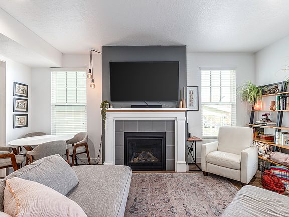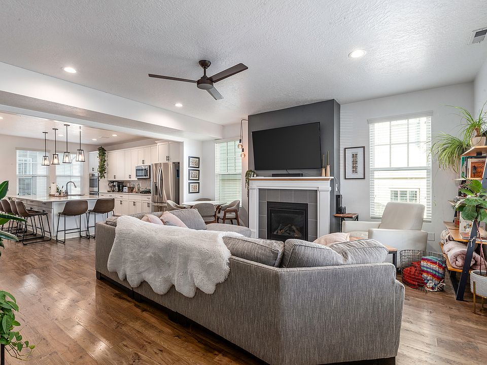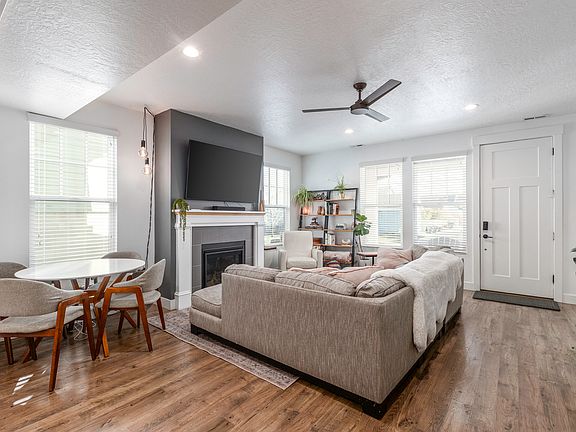 Discover modern living in the heart of Daybreak just steps from the lake, private fireplace pavilions, scenic walking trails, and an array of grocery, dining, and lifestyle conveniences all within a 5 minute walk. This beautifully designed home showcases premium quality materials throughout, featuring a 9' open-concept layout, stylish designer finishes, and a cozy gas fireplace that anchors the main living space. The chef-inspired kitchen is an entertainer's dream, complete with a double-wide quartz island with pendant lighting, gas cooktop, double ovens, and a large walk-in pantry for extra storage. Upstairs, the luxurious primary suite offers vaulted ceilings, a spacious walk-in closet, double sinks, and stunning mountain views. Your personal retreat to relax and unwind. Additional 2 bedrooms, bathroom, and linen closet for storage. Enjoy outdoor living year round beneath the spacious front covered porch, or host guests on the covered patio that leads to the 2-car garage, featuring a EV charging outlet and finished with durable epoxy flooring for a clean and polished look. Square Footage figures are provided as a courtesy estimate only. Buyer is advised to obtain an independent measurements.