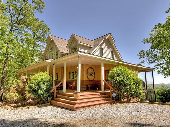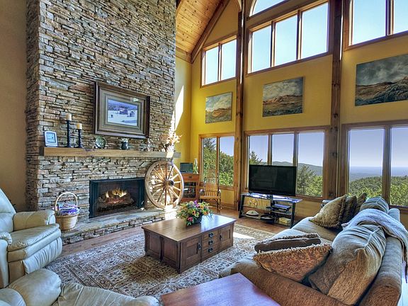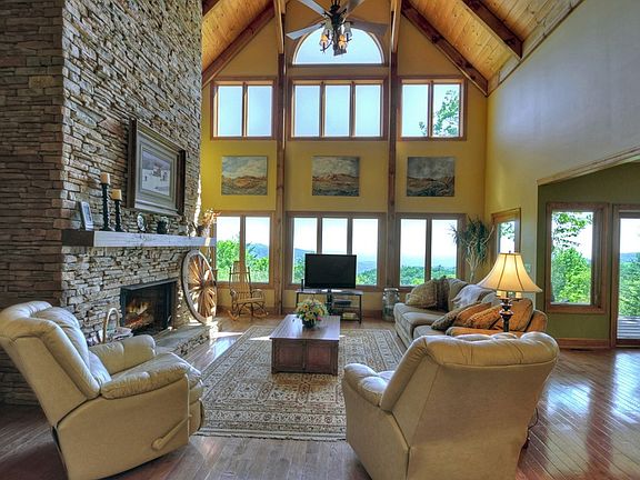 LONG-RANGE MOUNTAIN VIEWS AND ADJOINING U.S.F.S!! This magnificent mountain estate with excellent craftsmanship offers main-floor living with master- and laundry-on-main, Chef's kitchen w/custom cabinetry and granite countertops open to dining area w/perfect view of the mountains, greatroom w/soaring stacked stone fireplace, wood beams and wall of windows showcasing the view, finished terrace level w/recreation room and storage, private hottub area, wrap-around decks, drive-under garage could be used to store mountain toys or used as a workshop/storage, level front & back yards w/hiking trails into the USFS, ample parking w/circular drive and room to build a detached garage or workshop, alarm system and camera's in place for security, gated shared driveway and located within 10-15 minutes from downtown Ellijay or Chatsworth with paved roads on prestigious Fort Mountain.