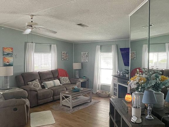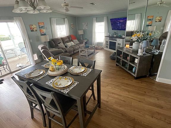 This 2 bedroom 2 bath home is ready for move in and has been well maintained. It has a metal roof, screened in porch on front of home, vinyl enclosed lanai on side of home, located on a perimeter lot. It has inside laundry, open kitchen, separate dining area, new vinyl flooring, new light fixtures, new refrigerator, and many other upgrades, new furniture, new fire place,and is priced to sell.