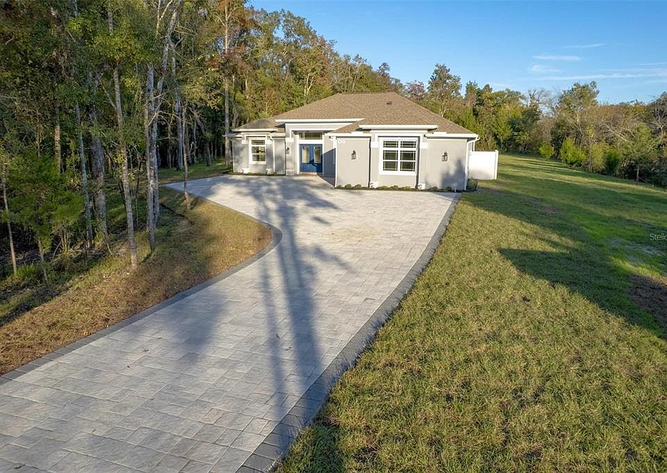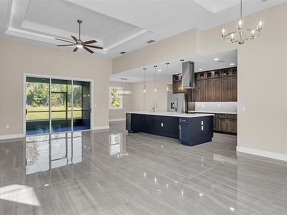 One or more photo(s) has been virtually staged. A true masterpiece of modern luxury, this custom-built 3-bed, 2-bath residence welcomes you through grand double entry doors into a world of sophistication. Sun-drenched interiors, wrapped in elegant tile, flow effortlessly through an open layout designed for both style and comfort. At the heart of the home, a sleek electric fireplace sets a refined tone and perfect for quiet evenings or upscale entertaining. The showpiece kitchen is nothing short of exceptional, featuring a stunning quartz island with an integrated sink, premium smart appliances, and abundant prep and presentation space. Every detail has been curated for those who appreciate high-end design and effortless functionality. Two beautifully appointed guest bedrooms feature custom ventilated wooden shelving and share an upscale finished bath. The luxurious master suite offers a serene escape with its enclosed glass shower, freestanding sculptural soaking tub set against a striking tiled feature wall, dual granite vanities with designer backsplash, and an expansive walk-in closet enhanced by a custom solid-wood organizer. Step outside to the outdoor living area, a tiled lanai enclosed with full screening and kickplate—perfect for morning coffee, evening gatherings, or peaceful moments overlooking the generous backyard and the impressive 1.21-acre property. All of this is ideally situated just moments from charming boutiques, inviting restaurants, local markets, and beloved small-town attractions. Here, elevated living meets the warm character and convenience of a truly vibrant community.