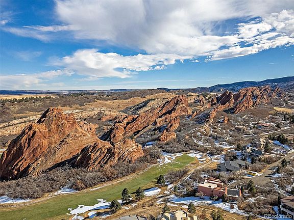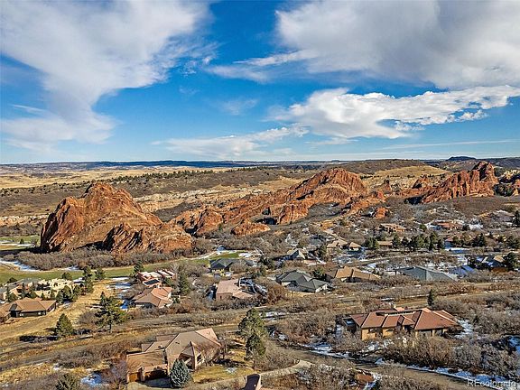 This tasteful southwestern style home sits high on the building site and captures amazing views of the unique rock formations, city lights, Chatfield Lake & Pike National Forest! The main floor is host to the updated kitchen with hickory floors, leathered granite counter tops, breakfast bar, stainless appliances including a 5-burner gas range, refrigerator with 2 separate vegetable drawers, a corner sink, a planning desk, a walk-in pantry, microwave oven, oven & warming drawer. The spacious kitchen nook opens to the great room with 12' high ceilings, gas fireplace & 2 decks. The primary suite is privately located and boasts a dual sided fireplace, access to one of the large decks, a 5-piece bath ensemble which includes 2 separate vanities, jetted tub, shower and walk-in closet. The study or 2nd bedroom shares the dual sided gas fireplace and has access to the deck. There is a spacious dining room, powder bath, walk-in coat closet & laundry on this level of the home as well. The walk-out basement is comprised of a huge family room, gas fireplace, a custom book case that spans an entire wall, a bonus/exercise area, 2 additional bedrooms & a full bath. There is a large unfinished area providing ample storage space. This masterpiece has brand new maintenance free garage doors, a new furnace & A/C (2022). The H20 unit was replaced in 2016 and the roof was replaced in 2005, coated with a GACO silicon system with a transferrable warranty until 2043. This spacious home has a fabulous, open floor plan, large windows that bring the mystical environment right inside and mesmerizing 180 degree views!