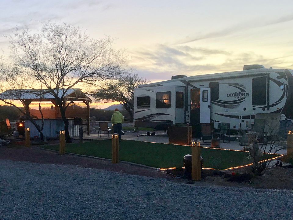 Buy it with your friends or family or by yourself! Snowbird paradise! 4.99 acres. Front acre in landscaped with two artificial grass lawns, two water features, young fruit and palm trees, outdoor “kitchen” with running water, fan, lights and small fridge. The outdoor kitchen was built with beautiful redwood. There are two full hookup RV sites with cement porches. Both have 50 amps and septic hookups. Quiet neighborhood and beautiful mountain views and sunsets.City water, septic, Trico Electric. This could also be a snowbirds delight! Bring your friends and family....room for everyone! Want horse property? The back portion of the property is fenced and has water. There are two paddocks and one big area with a loafing shed. Bring your own dreams to this great set-up!