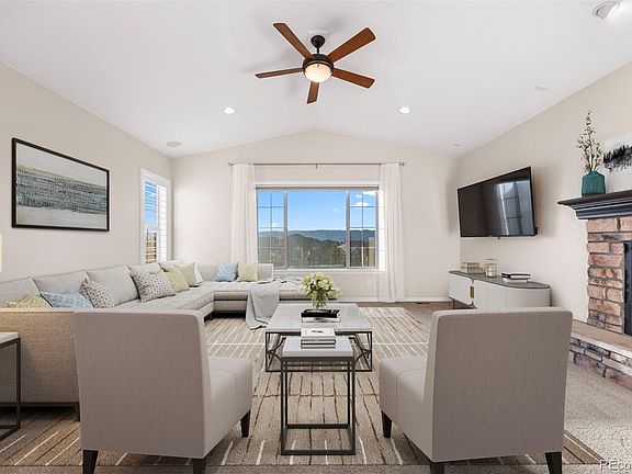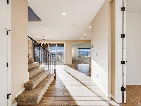 Experience resort-style living in the exclusive gated community of Backcountry, where this stunning home offers breathtaking mountain views from the entire back side. Nestled on an oversized cul-de-sac lot with no neighbors in front or behind, this 5-bedroom, 5-bathroom home combines space, elegance, and privacy. Inside, you'll find 9-foot ceilings, plantation shutters, and prewired surround sound throughout. The main floor features a private office, a spacious dining room, and a cozy family room with a stone-framed gas fireplace. The gourmet kitchen, open to the family room, is equipped with stainless steel appliances, a gas cooktop, ample cabinetry, and a large island with quartz countertops. The covered, lighted deck is perfect for enjoying incredible mountain views and spectacular sunsets. Upstairs, the newly painted and carpeted second floor includes three additional bedrooms, two bathrooms, and a spacious primary suite. The luxurious primary ensuite boasts a soaking tub, dual vanities, a makeup station, and his-and-her walk-in closets. The finished walkout basement includes a second family room/game room, a wet bar, a home theater with a movie projector, an additional bedroom, and a bathroom. If desired, this space can function as a complete in-law suite with its own separate entrance. Residents of this exclusive community enjoy access to all four Highlands Ranch recreation centers and the private Sundial Backcountry clubhouse, featuring a resort-style pool, modern fitness center, viewing lounge, and event space. Outdoor enthusiasts will love the nearby Backcountry trails and community parks, while a new coffee shop at the community entrance adds a touch of convenience.