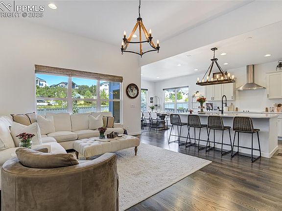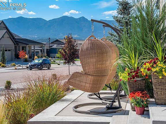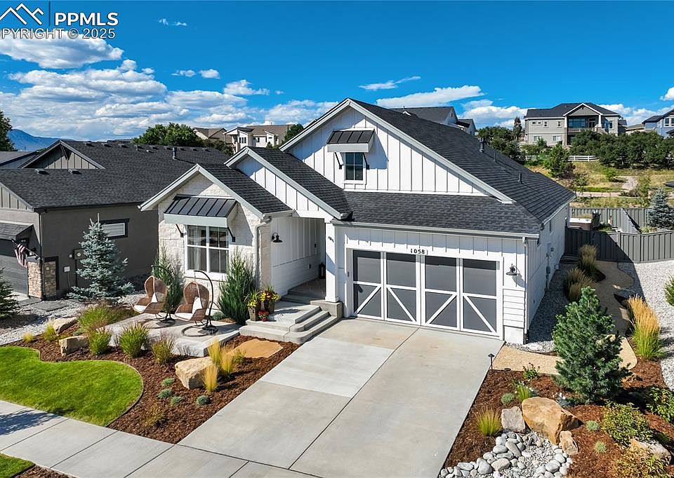 Where soaring ceilings, curated finishes + mountain-vista views converge—this modern farmhouse is a sanctuary of style, backing to open space + community trails w/mountain + Air Force Academy views. Inside, extended hardwoods sweep through most of the main lvl. 11’ ceilings, walls of windows + a floor-to-ceiling brick-clad gas fireplace w/rustic beam mantel anchor the GRM in warmth + texture. The kitchen blends intention + artistry w/soft-close cabinetry, quartz countertops, center island, herringbone tile backsplash, stainless steel appliances including Samsung Duo Flex Oven + walk-in pantry. A double barn-door flex rm provides versatility—ideal office/play/bedroom—while a separate 2nd bedroom on main sits alongside a full bath. The spa-inspired primary retreat features heated tile floors, expansive quartz-topped vanity w/brass-accent mirrors + fixtures, a smoke-tinted frameless shower + generous walk-in closet. Convenient main-lvl laundry is plumbed for future sink + finished garage keeps daily life effortless. Downstairs, 9’ ceilings expand the experience w/a spacious rec room anchored by a gas fireplace + two additional bedrooms—one an artisan Junior Suite w/private ensuite rich in texture + warmth w/heated tile floors + walk-in closet. A well-appointed 3/4 bath + lg storage rm complete the lower level. Outdoors, low-maintenance beauty shines w/mature plantings, seasonal color, rock accents, extended patios, a turf putting green + hot tub. Notable Details: Quartz Countertops Throughout, 95% energy-efficient furnace, Central A/C, 50-gal hwh, humidifier + radon mitigation syst. Located in The Farm—a lifestyle-rich community where nature + connection meet—walkability to The Gathering Place clubhouse, pool, fitness center, parks, nature preserve areas w/ponds, trails + community events. Award-winning D20 schools, vibrant shops + dining, St. Francis Hospital, across from USAFA + easy to I-25 + Powers make this home as convenient as it is captivating. *Assumable Loan*