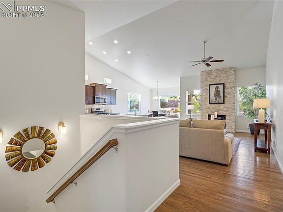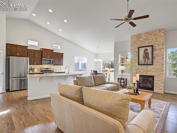 This refined modern ranch, set within a low-maintenance, gated enclave, blends timeless elegance with contemporary ease to deliver a beautifully elevated way of living. Inside, 9’+ main-level ceilings and a soaring, window-wrapped great room wash gleaming hardwoods in natural light, while a gas fireplace with a floor-to-ceiling stone surround anchors the space with quiet drama. The chef’s kitchen is equal parts form + function—espresso Shaker cabinetry, slab granite, a textured subway-tile backsplash, and a curved 10' island with undermount double sink + bar seating; pendant pre-wire awaits your signature fixtures, and a walk-in pantry keeps the look serene. A sunlit dining nook opens to an extended rear concrete patio and a well-manicured, private, fenced 0.19-acre backyard—an everyday retreat for coffee to cocktails. The primary suite is a calm sanctuary with dual granite-topped vanities, a glass-enclosed mud-set walk-in shower with bench, and a generous walk-in closet; a versatile second bedroom on the main flexes for guests or office. The secondary bath is thoughtfully appointed with tile floors, a granite countertop + a tub/shower surround tiled to the ceiling. The finished lower level continues the story with 9' ceilings, a spacious recreation room pre-plumbed for a future wet bar, two additional bedrooms, excellent storage, and a full bath with tile floors, granite, and tile-to-ceiling surround. Thoughtful upgrades include all-wood closet shelving throughout, stainless appliances with gas range, clerestory windows, HERS 63 energy rating, tankless water heater, oversized finished garage, and central A/C. Minutes to I-25 in award-winning Academy District 20, with effortless access to the Promenade Shops at Briargate, Victory Ridge, Polaris Pointe, the Air Force Academy + military installations. Timeless, turnkey, and tailored for easy Colorado living—thoughtful design, energy-smart comfort, and indoor–outdoor living in sync.