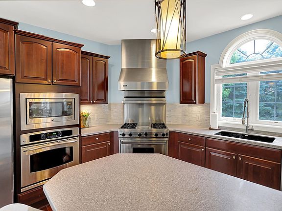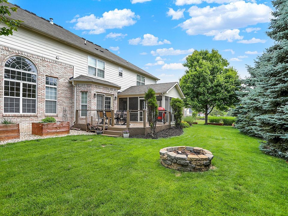 This spacious 5-bedroom, 4.5-bathroom home has all the space you need-and then some! Inside, you're greeted by a bright 2-story entryway filled with natural light and detailed with crown molding, wainscoting, and Brazilian hardwood floors. The kitchen is loaded with gourmet features including a Viking Professional Range, double ovens, 42" cherry cabinets, Corian counters, backsplash, and a huge center island. Extra cabinet and counter space, a walk-in pantry, and a built-in planning desk allow for daily convenience. A main floor office and flex room make the layout even more versatile for all lifestyles. All four upper bedrooms have their own walk-in closets and access to a full bathroom. The primary suite is extra-large with a sitting room that includes a cozy, private gas fireplace. The primary bath has a soaking tub, tile shower, and a dual sink vanity. There is also an upstairs laundry room with a utility sink for added convenience plus a bonus room that is perfect for toys or crafts. The finished basement is made for entertaining with the open space, kitchenette/wet bar, a 5th bedroom, a full bath, and a big storage room with shelving. Daylight windows and tall ceilings keep the space light and open. Outside you will enjoy the screened-in porch, deck, firepit, and beautifully landscaped yard with irrigation system. No backyard neighbors and a big common green space out front make this location even better. This one checks all the boxes-space, style, and great outdoor living!