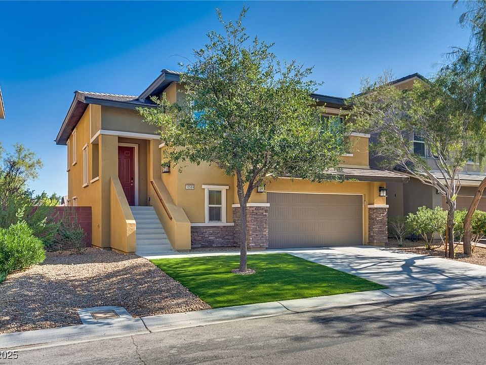 Welcome to this spacious split-level home in the heart of Summerlin South, just a short walk to Mesa Park. This residence features a bright, open floor plan with multiple living areas, a sleek modern kitchen with stainless steel appliances, double ovens, and a large center island that's perfect for entertaining. The downstairs offers an additional bedroom and bath, while upstairs you'll find expansive living space with updated flooring and plenty of natural light. The oversized backyard is fully landscaped with low-maintenance turf and a covered patio, providing the ideal setting for outdoor living. With a two-car garage, modern finishes throughout, and a prime location near parks, trails, shopping, and top-rated schools, this home is the perfect balance of comfort and convenience.