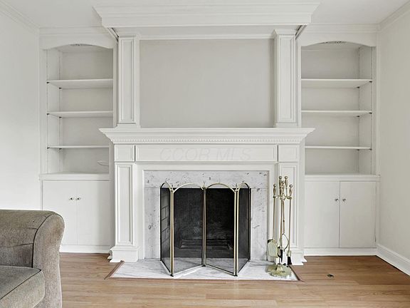 In the living room, a stately fireplace with its marble surround & traditional mantel becomes the natural gathering place, flanked by built-ins & framed by pristine crown molding & white trim. A generous triple window pours sunlight through the space, highlighting the elegant details of this home.