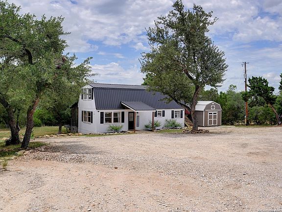 Beautiful home w/unique architecture & a big 24 X 30 (appx) metal RV barn/Workshop plus additional storage building. Great long range Hill Country views from the nice covered back deck. Attractive interior w/low maintenance vinyl wood look flooring, lots of windows, spacious kitchen w/quality cabinets, plenty of counter space, adjacent laundry room & private upstairs owners retreat w/outside access. Clean, clean, clean! Metal roof. Plenty of space for your RV & lots of parking. You will enjoy the private setting, wildlife & beautiful sunsets are the icing on the cake! Shady, very usable 1 acre(appx) lot in a great location. Easy commute to San Antonio, Austin, San Marcos, New Braunfels, Blanco & just a hop skip & a jump to all the amenities at Canyon Lake & the Guadalupe River. Great schools. This one will not last, Priced to sell!!!