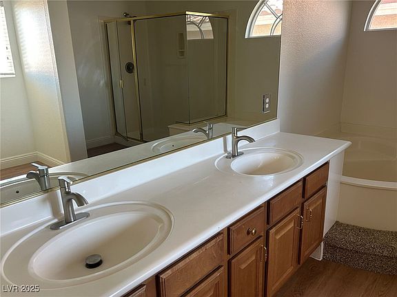 Spacious master bathDual vanitiesUpgraded eat in kitchenBreakfast nookGas fireplaceTub and showerWalk-in closet