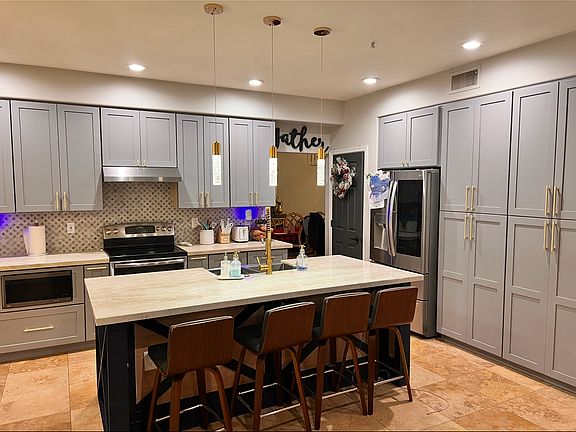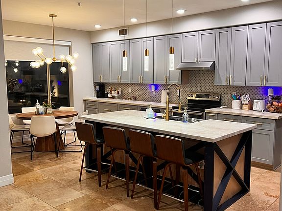 Newly renovated kitchenGranite counter topsTravertine flooringResort style backyardFire pit seating area