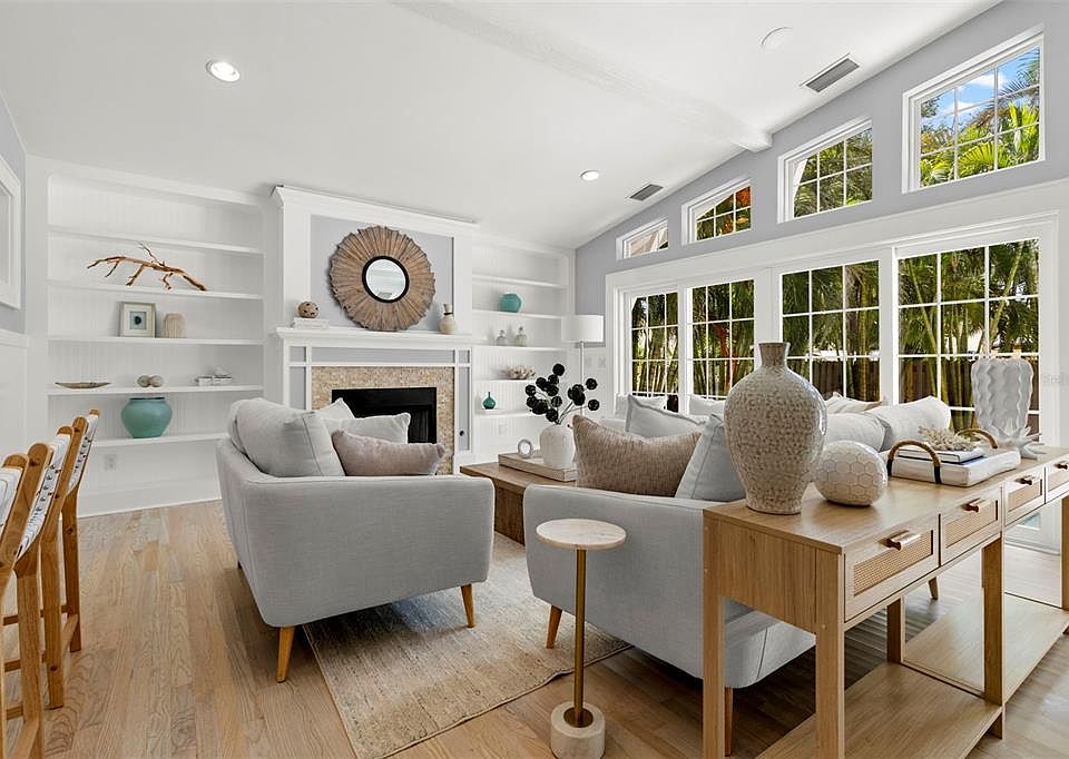 Natural gas fireplaceCompletely remodeled kitchenWall of floor-to-ceiling windowsMature tropical palmsBeautiful quartz countertopsHigh beamed ceilingsSunlit family room