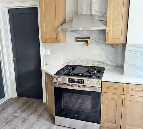 This brand new private 1 bedroom 1 bath apartment features: open concept living room with electric fireplace; modern light wood cabinets and stainless-steel appliances with Quartz countertops in kitchen, plus a pot filler for the gourmet chef; huge bathroom with rain shower; and closet with barndoors in bedroom, hardwood laminate flooring throughout, dark gray slate flush doors, large french bay windows allowing lots of sunlight in entire apartment, washer and dryer for exclusive use of tenants and apartment's own dedicated entrance.