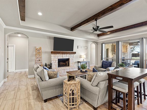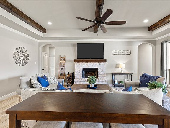 The chef’s kitchen shines with granite countertops, stainless steel appliances, a large island with seating, elegant pendant lighting, and plenty of cabinet space. The kitchen opens into a cozy living room with a stone fireplace, rich wood-beamed ceilings, and large windows that fill the home with natural light.