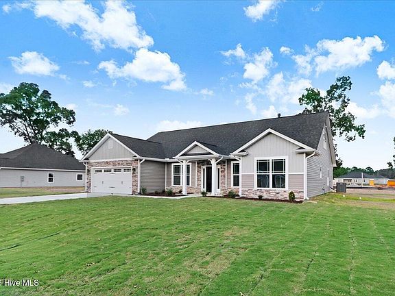 Additional highlights include a large laundry room, finished 3-car garage with 4FT extension, openers and remotes, and a striking exterior with low-maintenance vinyl siding and stone accents. Situated on a spacious lot, this home offers no city taxes and convenient access to Seymour Johnson AFB, Kinston, New Bern, Hwy 42, and the beautiful NC coast.
