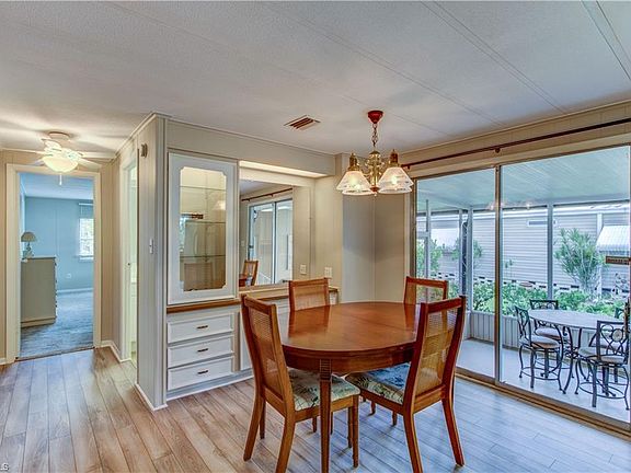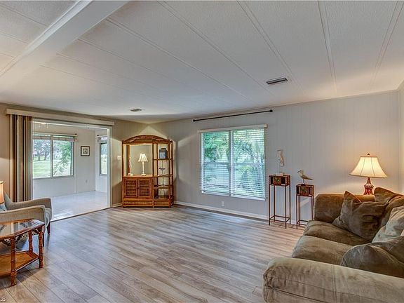 Back on the Market! Live in Paradise on a budget in Naples on your own land! Super clean property with golf course views! The home has been updated with New Straps and Anchors and HUD Certified, electrical panel new flooring, interior paint, window treatments, and a vapor barrier. We have a master bedroom with an ensuite master bath. Plenty of space for additional areas to read in your enclosed Sunroom/Lanai. There is a covered carport area with a screened lanai and enclosed storage/laundry area if you like being outdoors. The property is located in an amazing and very active 55+ community with tons of amenities to use at your leisure. Activities and amenities include a pool, clubhouse, exercise, pickleball, tennis, bocce, and shuffleboard. The clubhouse is very social with card games, trips, and planned events. Low Hoa fees for all these amenities! Close to downtown 5th Ave area, shopping, beaches, and entertainment!