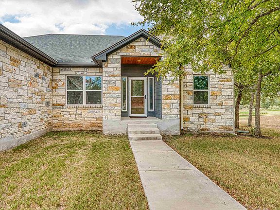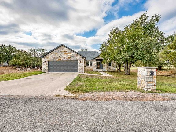 Beautiful custom-built 3-bedroom, 2-bath home with office located on the 5th hole of the Kingsland golf course. Enjoy incredible Packsaddle Mountain views and relaxing sunsets from the covered back porch. This home features an open layout with elegant tile flooring, high-end Samsung appliances, and plenty of storage and counter space. The primary suite offers a spacious walk-in shower, dual vanities, direct access to the laundry room, and a large walk-in closet. The oversized two-car garage includes a separate golf cart bay and pad with direct access to the 5th green—unique to this neighborhood. With top-quality finishes, smart design, and unbeatable golf course views, this home delivers Hill Country living at its best.