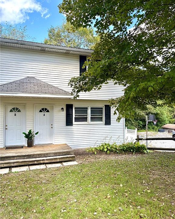 Affordable country living! Along a quiet gravel road, this two bedroom, one bathroom townhouse is the perfect place for you to call home. Walk into the spacious living room with a large picture window allowing for tons of natural light. Open to the living room is the eat-in kitchen that has plenty of room for a table and comes complete with an electric stove and refrigerator. There are also washer/dryer hookups included for your convenience! Through the sliding glass door you'll find a partially enclosed back deck that overlooks the woods. Upstairs are two bedrooms, both with walk in closets for plenty of storage, and a full bathroom. The whole home has been repainted and brand new carpet installed in the living room, bedrooms and hallway! Make this house your home today!