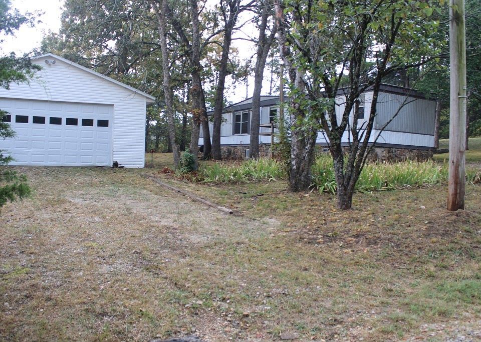 Here's Your Lake Get-A-Way - Home Plus 24 x 36 ft Garage / Shop Building - great for boat storage, workshop or both. Includes 2 bed/ 2 bath manufactured home, split bedroom plan, living - dining - kitchen combo with vaulted ceiling, rear deck with ramp for easy access, new mini split system, new interior paint, new roof coating Plus a 24 x 36 ft detached garage with vinyl siding, metal roof, & electricity. Home connected to public water and sewer, plus water & sewer are beside the garage in case you want to add a bath or efficiency apartment inside the garage. Sits on 2 lots with lots of shade trees only a few minutes north to Lake Bull Shoals with Corp of Engineers maintained park, boat launch and marina or a few minutes to south to 18-hole golf course. Shopping, post office, and bank only a few miles away, about 30 minutes to Harrison or 40 minutes to Branson, MO. Come See - Make this your get-a-way place or permanent residence.