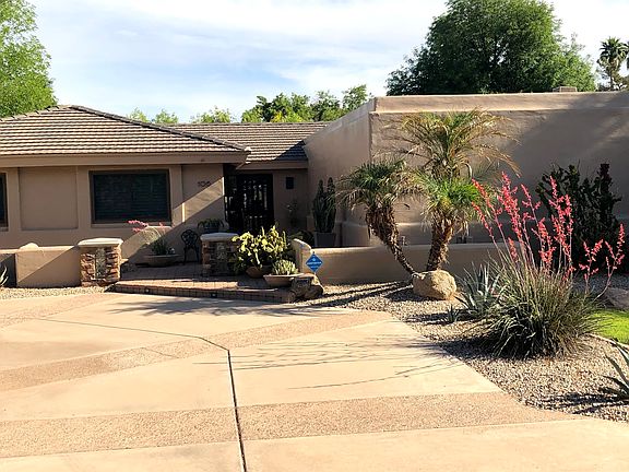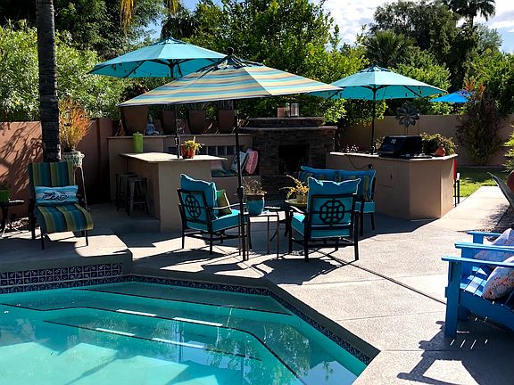 Sitting on a premium interior corner lot facing the community park, this beautiful custom home in gated Graystone offers 4 bedrooms and 3 baths in 2950 SqFt. Recent updates include a remodeled kitchen, new backyard, new HVAC, new Andersen windows, and new exterior paint. Open great room layout with vaulted beamed ceilings, fireplace, custom built-ins, wet bar, and saltillo tile floors. The kitchen features maple cabinetry, granite countertops, backsplash, stainless appliances, built-in desk and island with breakfast bar seating. An enclosed Arizona Room can be accessed from the master bedroom, dining area and kitchen, adding even more living space. The newly designed backyard was designed for entertaining and features a sparkling pool, propane fireplace with built-in bench seating, and* built-in BBQ with counter seating. Side yard has grass for kids & pets to play on, fruit trees, & RV gate. The master retreat has double door entry and a beautiful private bath with dual sink vanity, oversized tiled shower and two walk-in closets. Two secondary bedrooms share Jack & Jill bath. Other features include an oversized 3 car side entry garage with epoxy floors & expansive driveway, circle drive, paver front entry, plantation shutters, laundry room with cabinets & utility sink, and much more! Great schools and fun for foodies with several new restaurants including Ghost Ranch, Cotton and Copper, and a Postino's is coming soon! Schedule your private showing today!