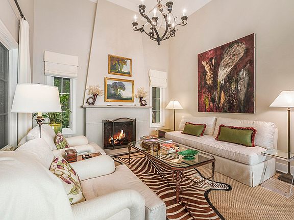 Professionally organized walk-in closetWood burning fireplaceDramatic two-story fireplaceCharming stucco exteriorScreen porchPrimary suiteRed clay tile roof